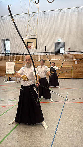 Danach ging es mit dem Dozukuri und der Aufrechterhaltung der Stabilität bis zum Zanshin weiter. Der Schwerpunkt hier lag im Annähern der Schulterlinie zur Pfeillinie und das Hineinarbeiten in den Bogen, dass dann, bei korrekter Ausführung, in einem kraftvollen Tai no warikomi endete.