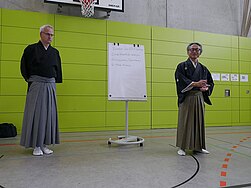 Der Vortrag am Sonntag beinhaltete einen kurzen Abriss der Shichi-Go-San Zeremonie, aber das eigentliche Thema war das Tachijarei (die Zeremonie im Stehen). Heute wählt man diese Form in der Regel, weil einer der Schützen kein Kiza/Seiza ausführen kann, in früheren Zeiten stand oft einfach kein Dojo mit sauberem Boden zur Verfügung.