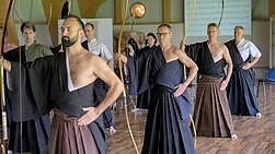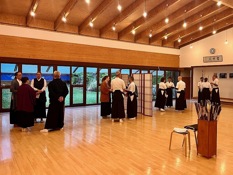 Bei den Zeremonien lag der Fokus auf hitotsu mato sharei. Zunächst wurde das von Shige, Marco und dem höchstgraduierten Teilnehmer demonstriert. Anschließend wurde das von den Teilnehmenden schrittweise unter Anleitung von Marco geübt. Erst die Bewegungen an der sadamenoza, dann der Weg zur honza und schließlich der Ablauf zwischen den Schüssen. Zum Abschluss wurde dann der gesamte Ablauf inkl. Schießen durchgeführt, und das von drei Gruppen parallel.