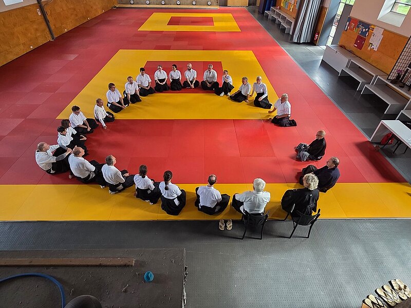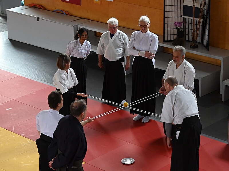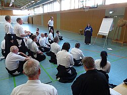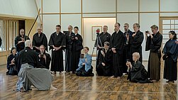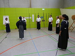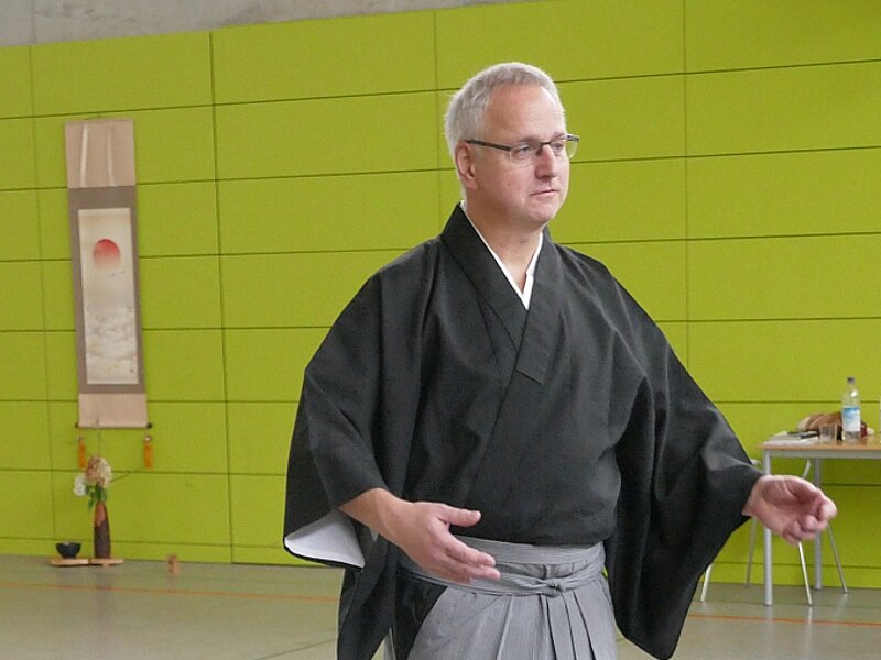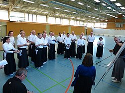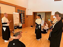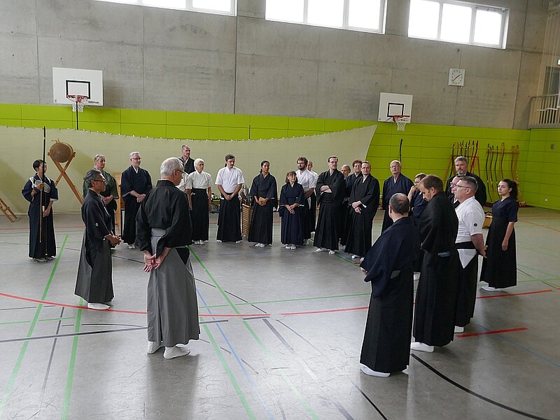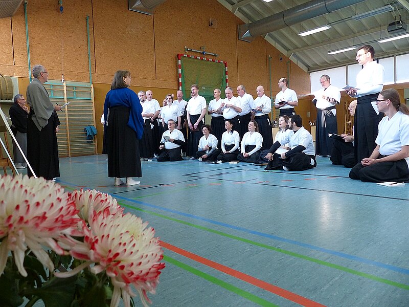 Die 30 Teilnehmenden aus dem norddeutschen Raum, Franken und Köln konnten die acht Arten der Verbeugung üben, die in den verschiedenen Zeremonien zum Einsatz kommen. Korrekte Haltung beim Gehen, Stehen, bei den Drehungen, tiefe und knappe Verbeugung, Setzen und Aufstehen aus kiza und sonkyo sowie Pfeil- und Bogenübergabe wurden einzeln und in Synchronizität mit Partnern geübt.