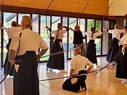 Die Praxis stand an diesem Wochenende klar im Vordergrund. So wurden nahezu ausschließlich im Taihai geübt. Kontinuierlich gab es Rückmeldung von Ingrid und Marco zu Kihontai. Und auch individuelle Korrekturen zur Schießtechnik kamen nicht zur kurz. Während die Renshi-Anwärter mochi mato sharei übten, setzten sich die anderen Teilnehmer mit Shitsu auseinander. Über die zwei Tage war bei allen Teilnehmern eine deutliche Leistungssteigerung zu erkennen. Die Bewegungen im Taihai wurden sicherer und harmonischer und die Qualität der Schüsse näherte sich den geforderten Prüfungskriterien. Dank der motivierenden Unterstützung durch Ingrid und Marco haben alle Teilnehmer von dem Wochenende sehr profitiert. Es ist klar, dass es innerhalb von 5 Wochen nicht möglich ist, die erhaltenen Korrekturen komplett umzusetzen. Jedoch wurde klar aufgezeigt, an welchen Scherpunkten bis dahin noch zu arbeiten ist. Final wünschten die Lehrer viel Erfolg bei der Prüfung. Augenzwinkernd ergänzte Horst vom ausrichtenden Verein, dass bei Nichtbestehen der Prüfung, die Teilnahmegebühr für das Seminar nicht erstattet wird.
