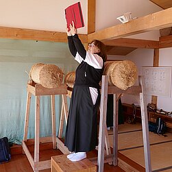 Wir hatten wunderbare Probanden in den Graduierungen 3. und 4. Kyu. Und damit ideale Voraussetzungen, um uns in der Vermittlung zum Übergang an das Mato-Schießen heranzutasten. Dazu konnten die Lehrbeispiele und Leitmaterialien aus vorangegangenen Praxisseminaren aufgegriffen werden. Es gab Gruppenaufgaben zum Thema Wettkampf und Mato-Schießen. Eine Probandin konnte erstmalig den Umgang mit einem Shitsu erlernen. Eine andere Trainergruppe nutzte vielfältige Lehrmittel. Sowohl das zur Verfügung stehende Whiteboard als auch ein Tablet wurden für eine Veranschaulichung durch einen Film genutzt, um den speziellen Ablauf des Enkin für den Schützen zu vermitteln. Es wurde am Ende mit dem positiven Feedback durch die Probanden belohnt.