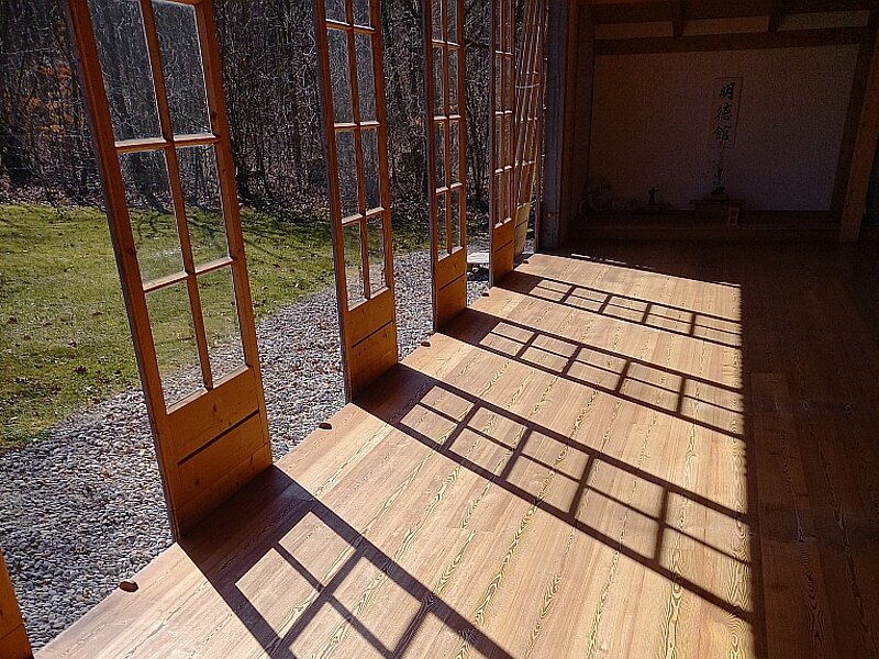 Am Samstag und auch am Sonntag früh war es draußen noch recht kühl. So zeigte das Thermometer zum Trainingsbeginn am Sonntag im Dojo eine Temperatur von 7°C an. Im Laufe des Vormittags setzte sich jedoch die Sonne durch und bei strahlendem Sonnenschein und blauem Himmel wärmte sich das Dojo auf angenehme Umgebungsbedingungen auf.