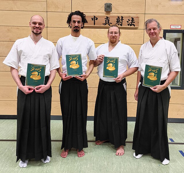Mit deutlichem Vorsprung haben sich dabei die Titelverteidiger aus Köln durchgesetzt und die Karlsruher auf Platz 2 verwiesen.Das Endergebnis lautet also:Platz 1: "Kyudo-Gruppe Köln - Team 1" aus Köln (Hermann Juli, Martin Knips, Karin Körner und Peter Henseler) mit 74 Treffern (102 nach Stechen)Platz 2: "Wasabi" aus Karlsruhe (Harald Kühn, Dirk Schaupp, Michael Brettschneider, Frank Baumgärtner) mit 74 Treffern (96 nach Stechen)Platz 3: "minininja" aus Frankfurt (Musa Karaca, Yoko Oikawa, Tobias Oswald, Stephan Walther) mit 69 Treffern.Glückwunsch an alle Sieger und viel Erfolg im nächsten Jahr! Die entgültige Rangliste und der Vereinsspiegel sind hier als PDF Download abrufbar. (Andreas Naumann)